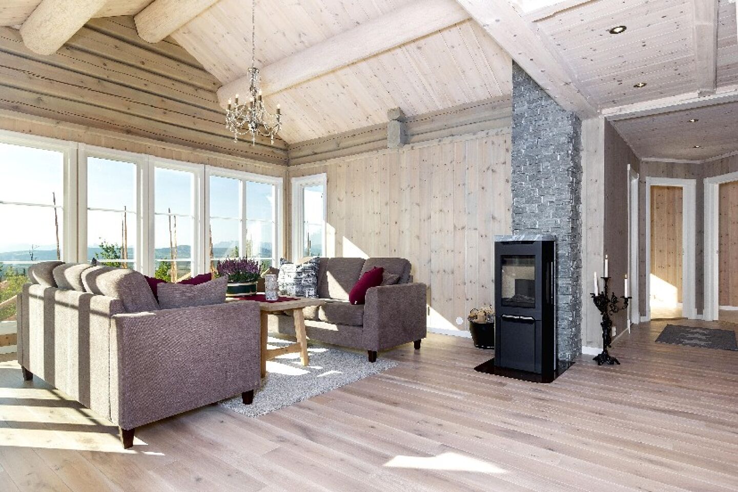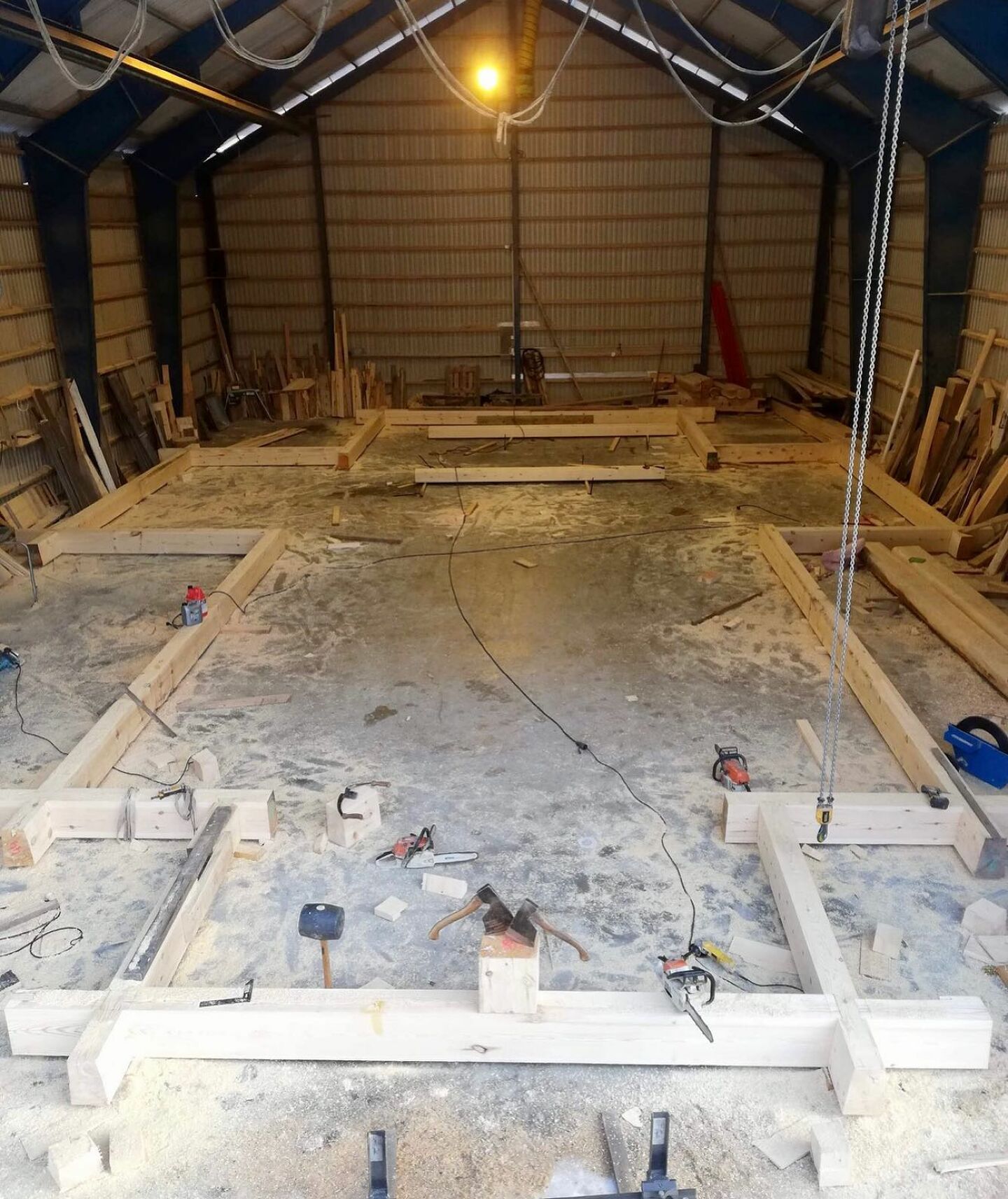 Tømmerrammer for åpne rom og store glasfelt, der grove dimensjonar blir sammenføyd for hand.